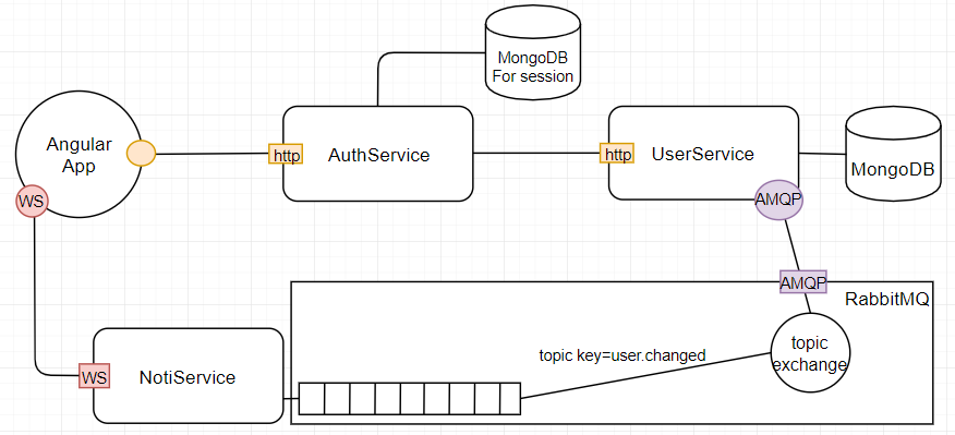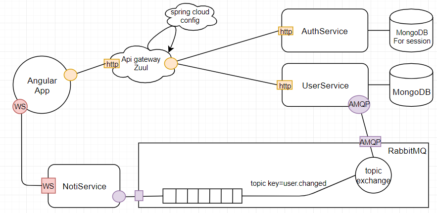 이를 보완하기 위해 일반적으로 Api Gateway를 이용합니다. 여기서는 Api Gateway를 지원하는 여러 라이브러리 중 Netflix의 zuul을 사용하기로 결정했습니다. zuul은 Websocket을 지원하지 않기 때문에 NotiService에 대한 요청은 그대로 두고, AuthService와 UserService에 대한 요청만 게이트웨이를 타도록 변경했습니다.
