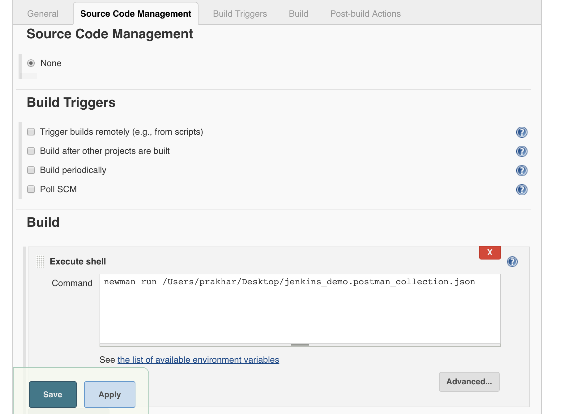 또 다른 advanced feature로는 Jenkins를 이용한 Test 자동화입니다. 이 기능을 사용하기 위해서는 jenkins가 설치된 서버에 newman이 반드시 설치되어 있어야 하며, 테스트를 하기 위한 Collection 역시 서버 내에 존재해야 합니다. 로컬에서 newman을 이용하여 테스팅하는 것과 동일하게, 젠킨스가 서버 내 존재하는 Collection 파일을 newman을 이용하여 실행하는 것이기 때문입니다.