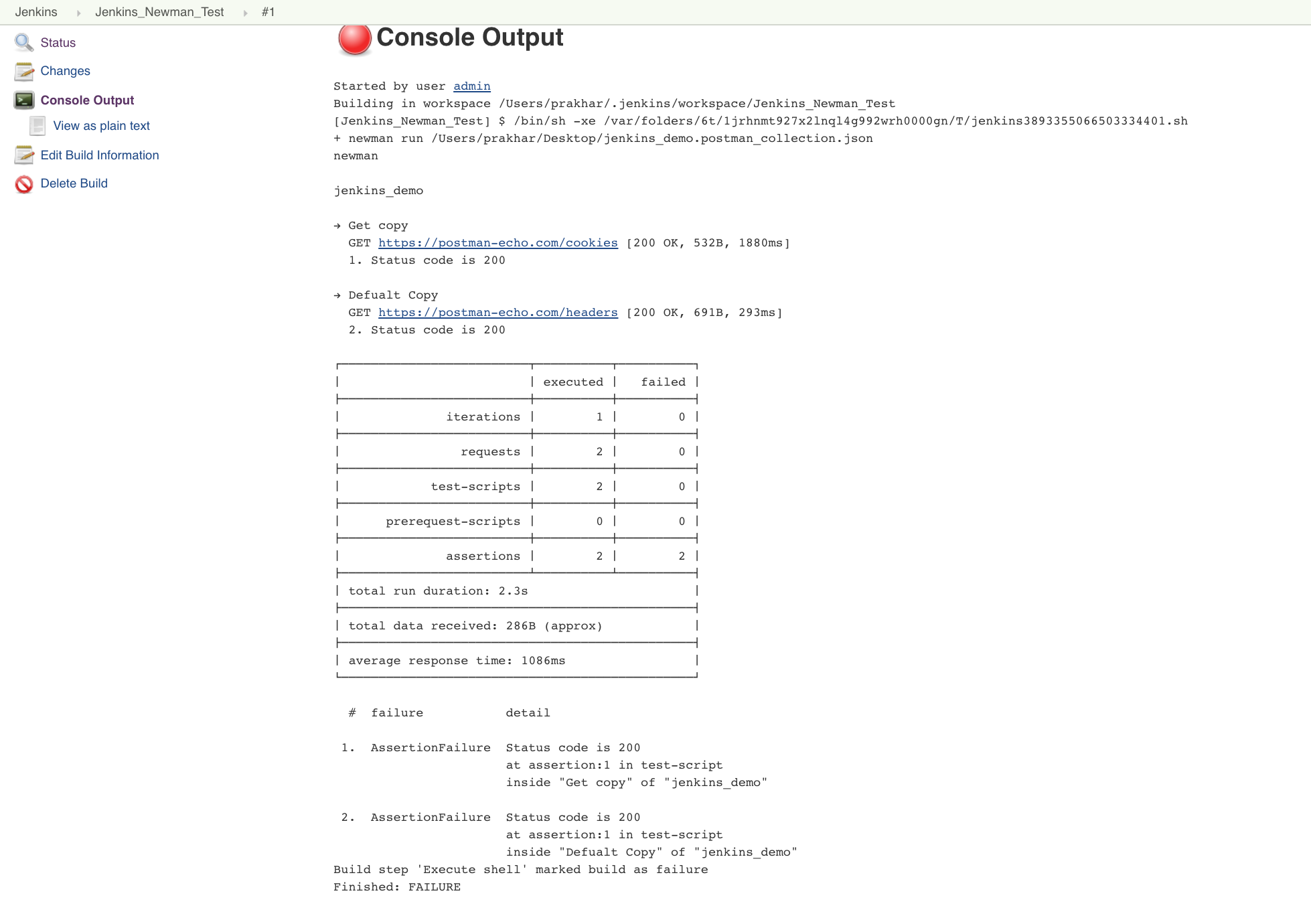 만약 실패한 리퀘스트가 있는 경우에는 Console Output 결과는 Failed로 출력됩니다.