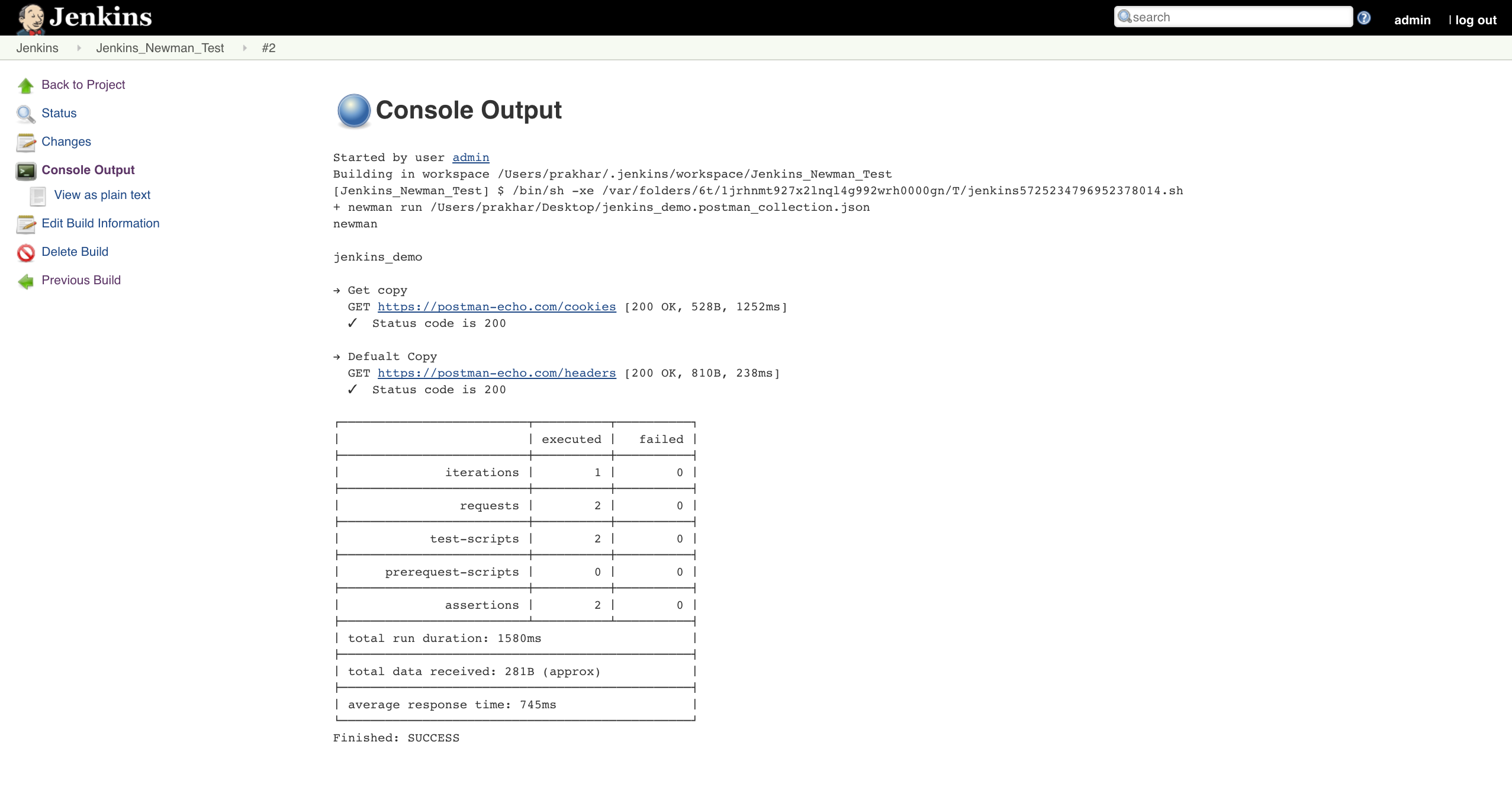 모든 결과가 Success된 경우, newman으로 실행할 때와 동일한 결과가 Console Output에 출력되는 것을 확인할 수 있습니다.