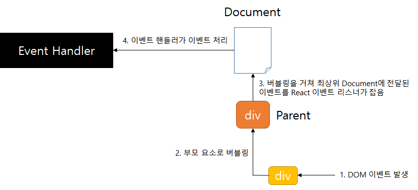 React는 최상위 부모인 document에 이벤트 리스너를 연결하였습니다. 각 요소가 아닌 document에 연결하는 것입니다. 이 덕분에 React는 좀 더 빠르게 동작하게 되는데, 이는 특히 목록에 대한 것을 다룰 때 더욱 그렇습니다.