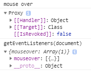 콘솔에서 조회해 보면 실제로 document에 이벤트 리스너가 등록되어 있는데, 마우스 오버 이벤트가 제대로 동작하는 것을 볼 수 있습니다.