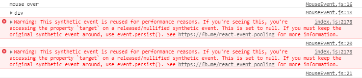 이벤트 핸들러가 한 번 실행되고 나면 합성 이벤트는 null이 되어 더 이상 사용할 수 없습니다. 그래서 이벤트 핸들러가 실행된 후에 이벤트 객체에 접근하기 위해 event 객체를 전역변수에 담거나, 콜백 함수에서 비동기적으로 사용하려고 생각할 수도 있습니다. 아래 예를 보겠습니다. (위의 마우스 이벤트를 수정하여 warning이 발생하도록 하였습니다)