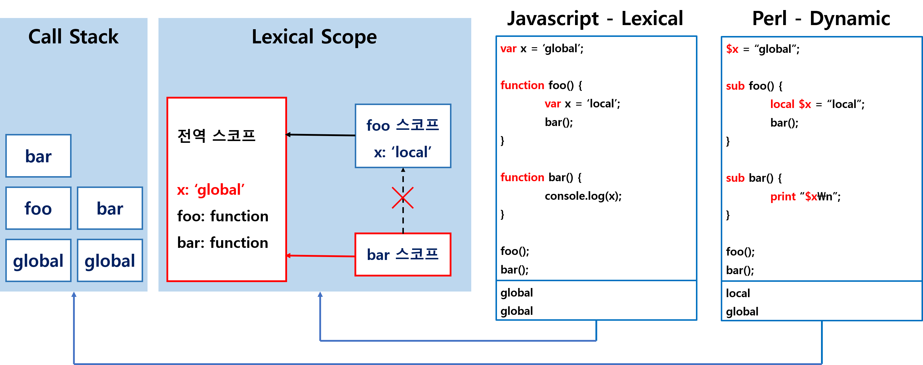 즉, 렉시컬 스코프는 함수의 호출 위치가 아니라 선언 위치에 따라 변수의 값이 결정됩니다. 자바스크립트는 렉시컬 스코프 언어입니다.