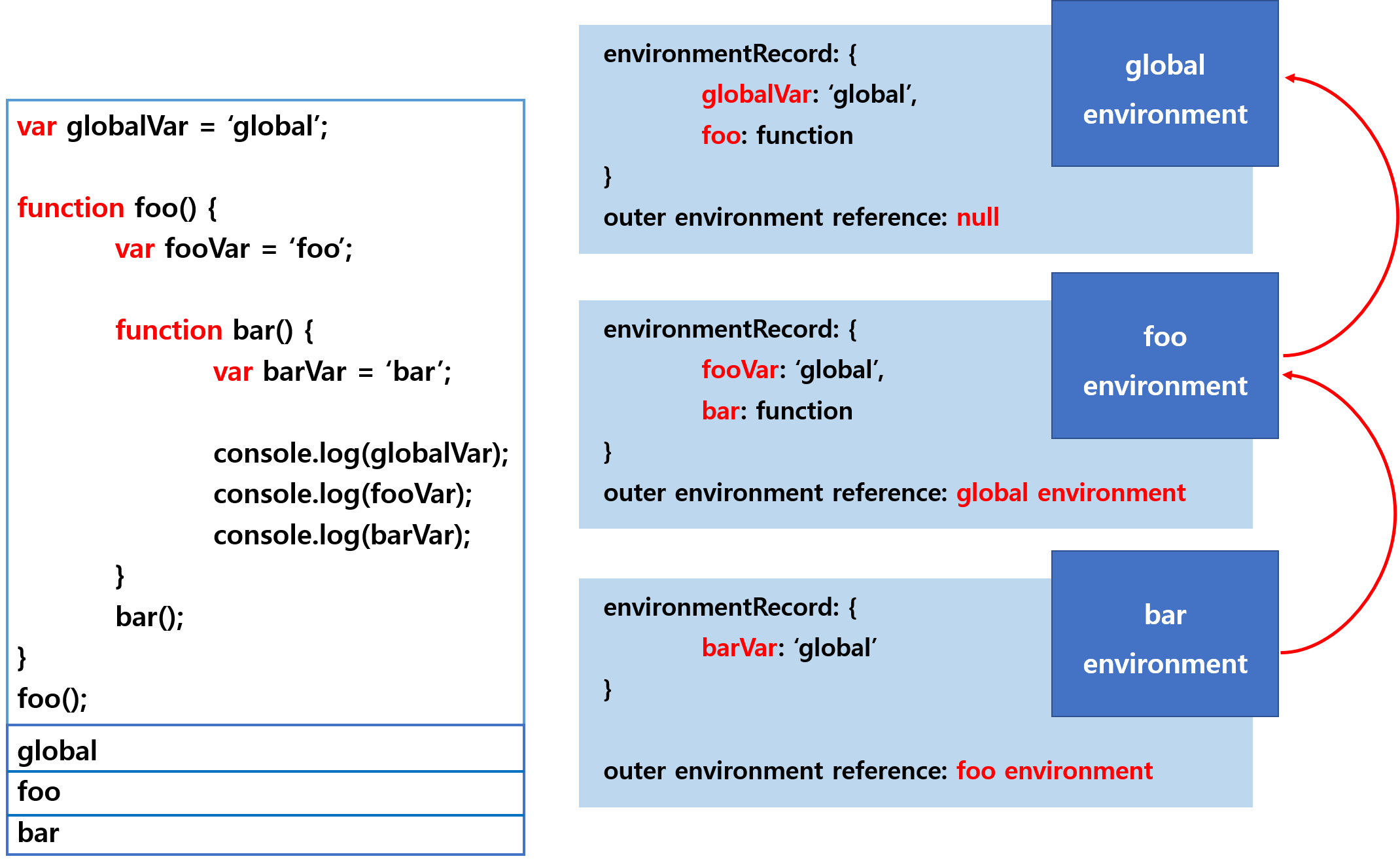 자바스크립트의 함수 객체는 [[scope]]라는 프로퍼티를 가지는데, 이 프로퍼티는 Object Reference 정보들을 일종의 정렬 리스트로 저장하고 있습니다. 즉, 변수의 검색은 이 Scope Chain 내에서만 탐색됩니다.