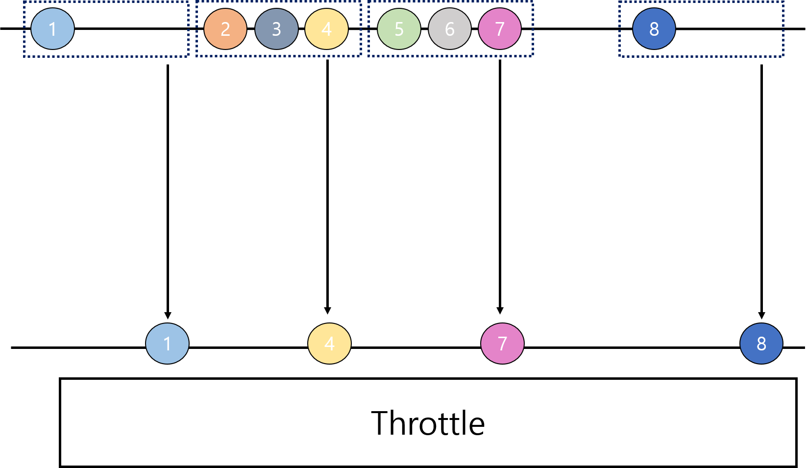 디바운스와 달리 스로틀은 사용자가 이벤트를 일으킨 점선 박스 시간 동안 기다렸다가, 가장 마지막에 호출된 이벤트를 발생시킵니다. 그래서 디바운스와 달리 1, 4, 7, 8의 이벤트가 발생하게 되는 것입니다.