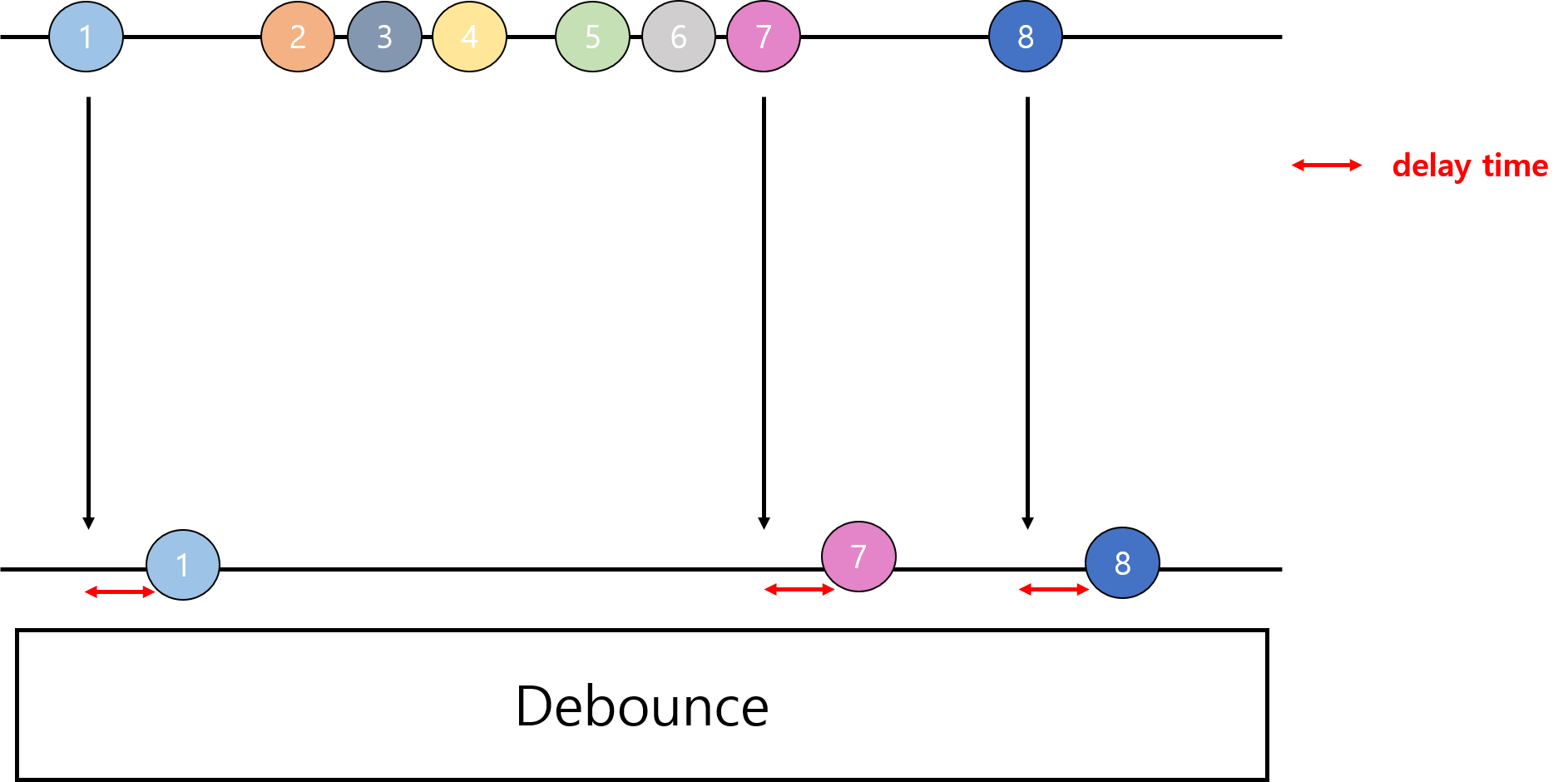 위 그림에서 1, 7, 8의 이벤트가 실행되는 것을 볼 수 있는데, 디바운스에 지정한 delay time 동안 사용자가 이벤트를 발생시키지 않았기 때문입니다. delay time보다 짧은 시간 내에 이벤트가 발생한 2, 3, 4, 5, 6 은 이벤트가 발생하지 않으며, 이것이 바로 디바운스의 특징입니다.