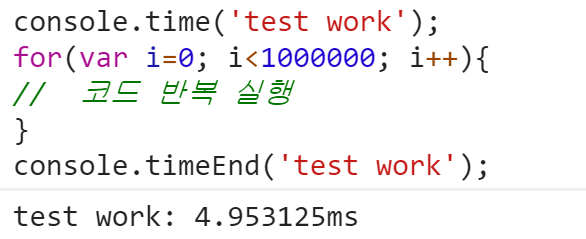 크게 차이나 보이지 않을 수도 있으나, Date를 이용할 때보다 코드가 짧고, 측정이 더 정확합니다. 또한 한 페이지 내에서 최대 1만 개의 다른 타이머를 동시에 추적할 수 있기 때문에 time 메서드를 사용하는 것이 더 좋습니다.