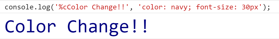 console.log('%cColor Change!!', 'color: navy; font-size: 30px');