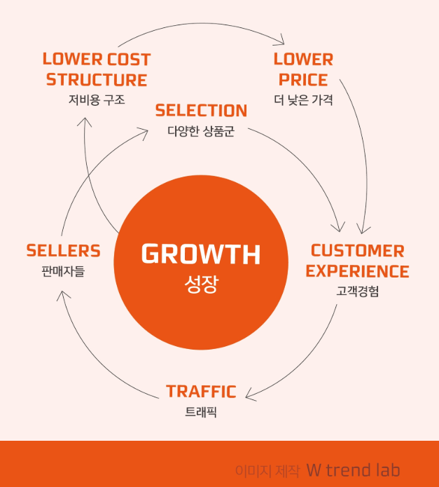 - 다양한 제품(Selection)이 고객 경험(Customer Experience)을 증가시키고, 이는 고객의 수를 증가(Traffic)시키며, 판매자의 수(Sellers)를 증가시켜 다시금 제품의 수를 증가시킨다.