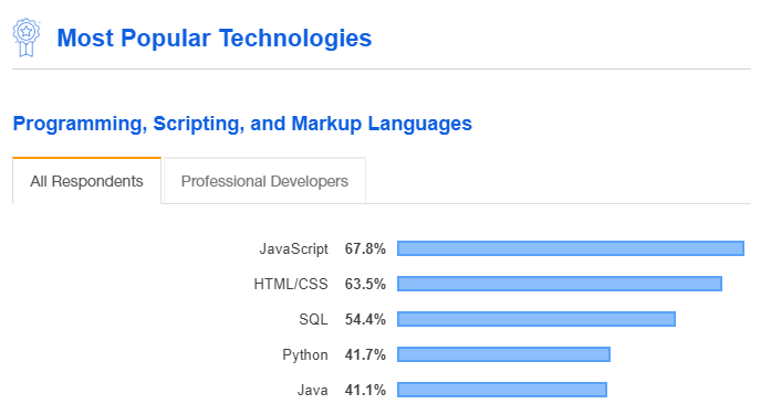 지난 10년간 자바스크립트의 시대라고 해도 좋을 만큼, 자바스크립트의 성장은 눈부셨습니다. 현재까지도 가장 인기있는 언어 1위로 자리를 공고히 하고 있으며, 오는 2020년에도 더욱 빠르게 성장했으면 했지, 느려지지는 않을 것으로 보입니다.