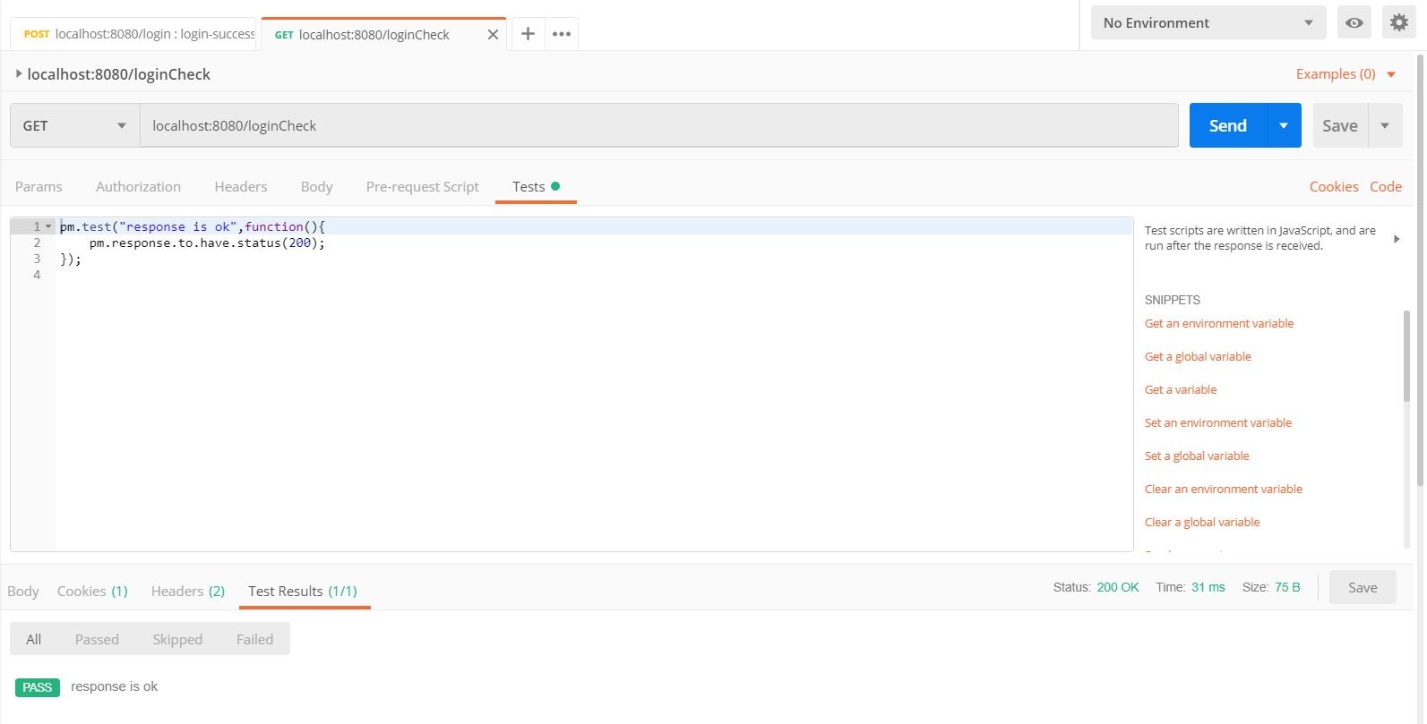 그럼 이제 로그인이 유지되고 있는지, 즉 세션에 User 객체가 존재하는 지 확인하기 위한 loginCheck 요청을 수행해 보겠습니다.
