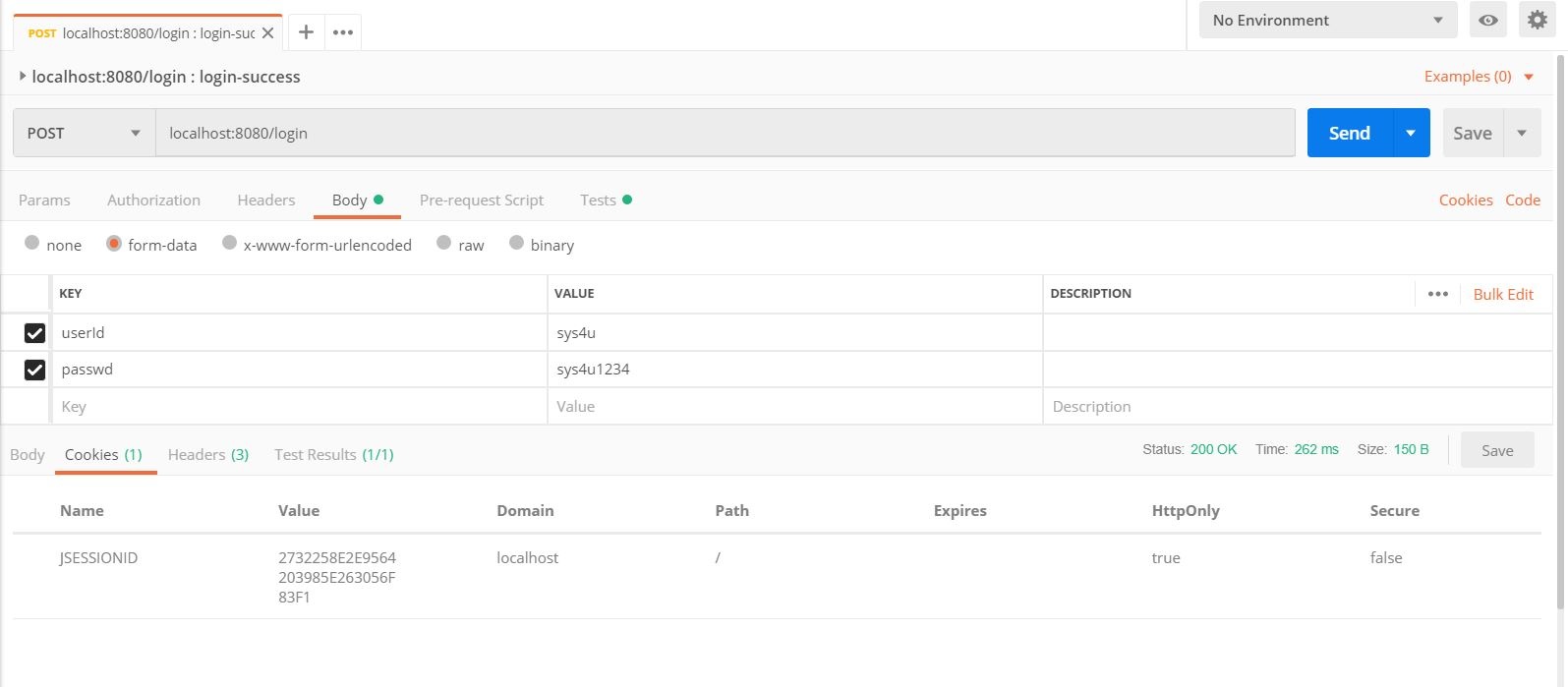 요청에 대한 결과로 Cookies에 JSESSIONID가 들어간 것을 확인할 수 있습니다. Postman은 쿠키가 등록되면, 화면 우측의 Cookies를 통해 어떤 쿠키가 존재하는 지 확인할 수 있으며, 여기서 삽입, 삭제, 변경 또한 가능합니다.