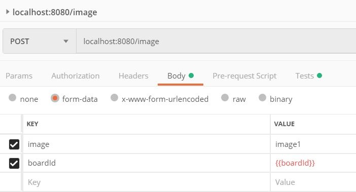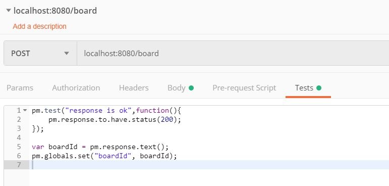 이 요청은 boardId를 반환합니다. boardId 정보를 test script에서 전역 변수로 만들어줍니다.