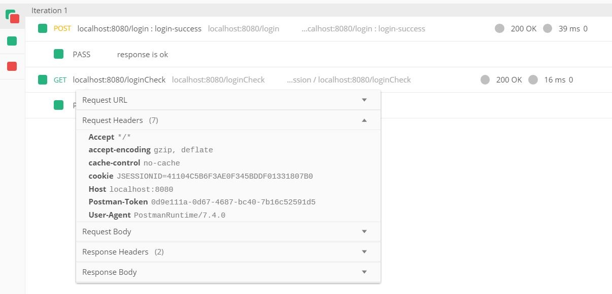 세션을 사용하여 로그인을 유지하는 경우, 일반적으로 서버와 브라우저 간 통신에서 세션이 유지되는 이유는 JSESSIONID라는 세션 식별자때문입니다. 서버에서 Response 헤더에 세션 식별자인 JSESSIONID를 set-cookie로 추가하여 응답을 보내면(Java Servlet의 HttpSession의 경우 세션 객체를 사용하기만 하면 자동으로 이 작업을 수행) 클라이언트 헤더가 이를 읽고 다음 요청 시에 cookies에 JESSIONID를 추가하여 전송하게 됩니다. 즉, 서버는 JSESSIONID를 통해 세션 정보를 특정화하여 사용할 수 있게 되는 것입니다. 이 모든 것이 가능한 이유는 브라우저가 이를 수행하기 때문인데, Postman 역시 동일하게 수행됩니다.