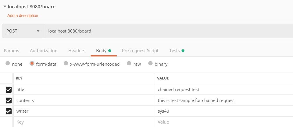 정상적으로 동작합니다. 이는 Collection Runner를 통해 Chanined Request로 처리했을 때 더 확실하게 확인할 수 있습니다.