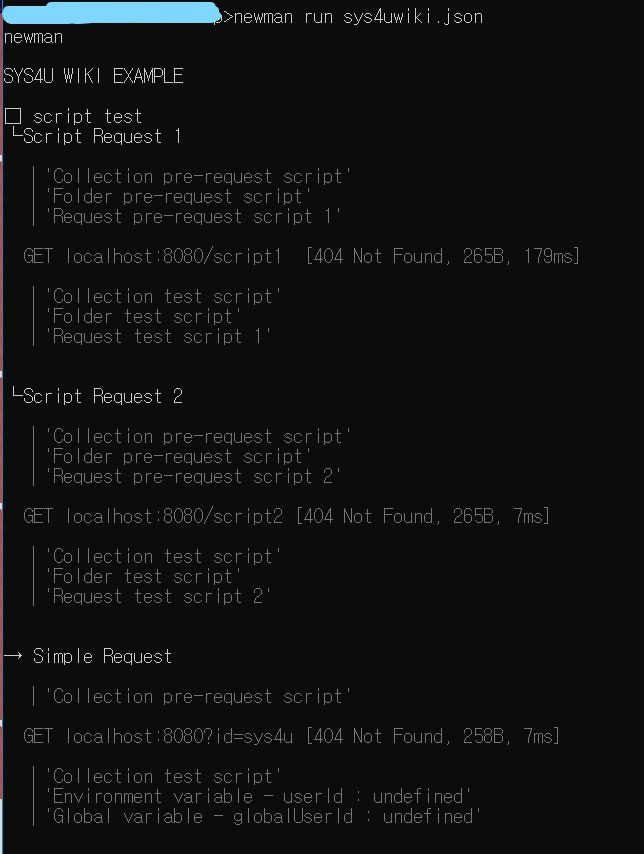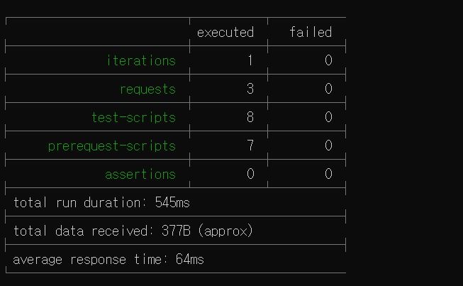 newman을 통해 컬렉션을 실행하게 되면 아래와 같이 결과를 출력합니다.