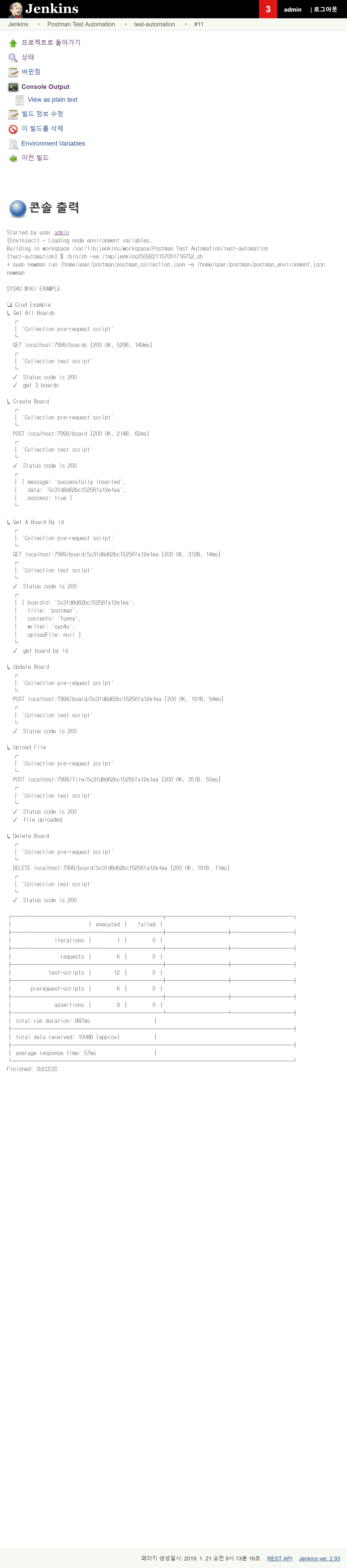 로컬 상에서 newman을 이용하여 테스팅하는 것과 동일하게, 젠킨스가 newman 명령을 이용하여 collection JSON 파일을 실행하는 것이기 때문입니다.