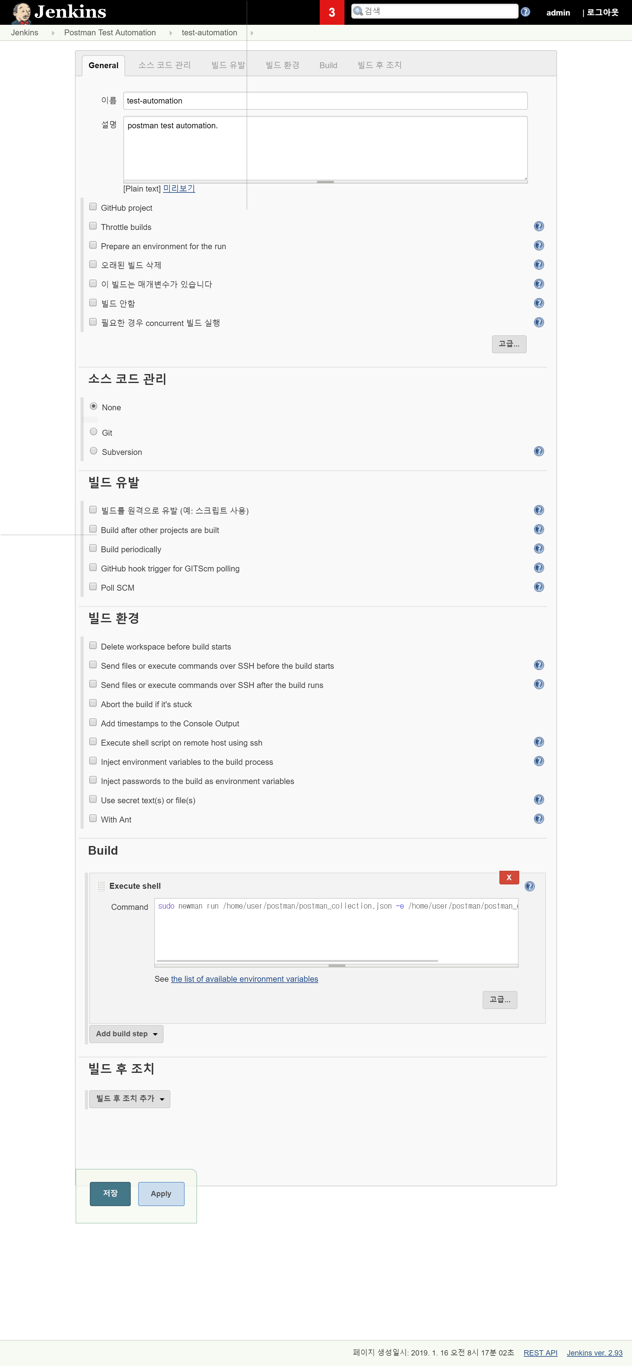 테스트 자동화를 위해 젠킨스 프로젝트를 생성하고, Build에서 아래 명령어를 실행합니다.