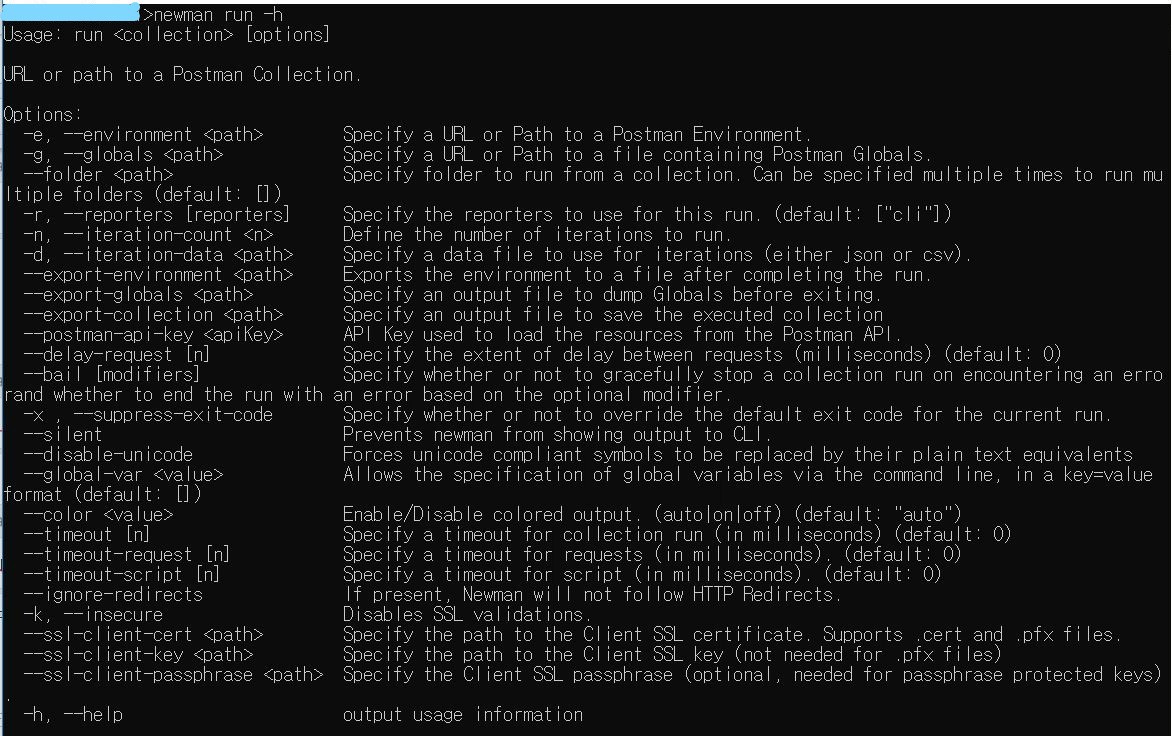 newman run에 대한 옵션 정보는 아래와 같습니다.