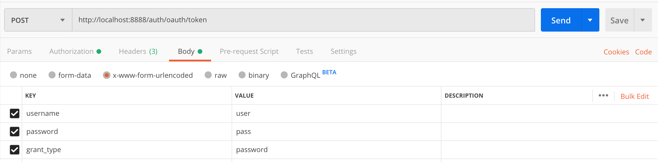 - username, password, grant-type 필드를 필수적으로 입력해주어야 합니다.