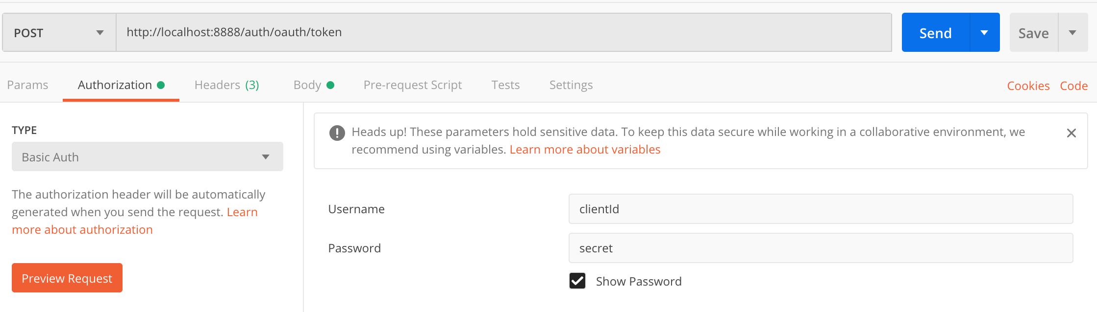 - 요청을 보낼 때에는 항상 client 정보를 함께 넘겨주어야 합니다. postman에서는 Authorization 탭에 client 정보를 입력해주면 됩니다.