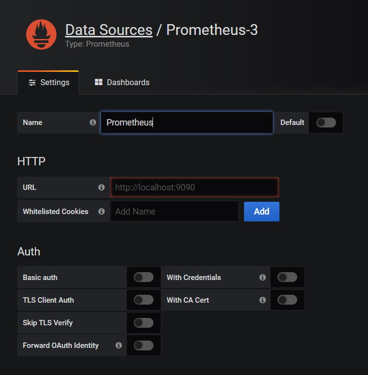 여기서 중요한 것은 URL입니다. 이 URL에는 프로메테우스 서버의 URL이 기재되어야 하며, 프로메테우스 서버는 내부 IP를 가지고 있는 서비스로 노출되어 있기 때문에 이를 조회해야 합니다.