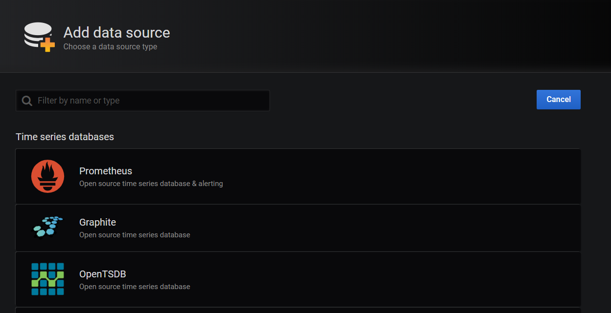 메인화면에서 Add data source를 선택하면 아래와 같이 추가할 수 있는 목록이 나열됩니다.