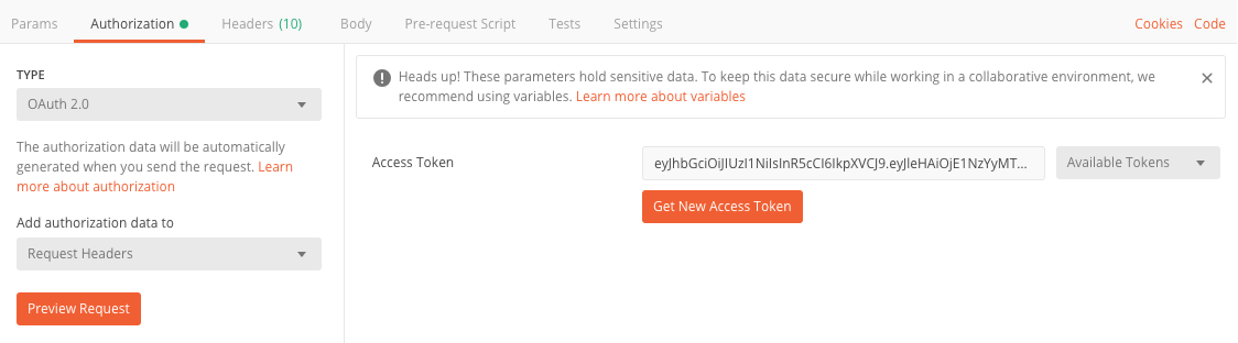 Authentication을 통해 발급받은 Token을 전달해주어야 하는데, Postman에서는 Authorization 탭에 실어 보냄으로써 테스트할 수 있습니다.